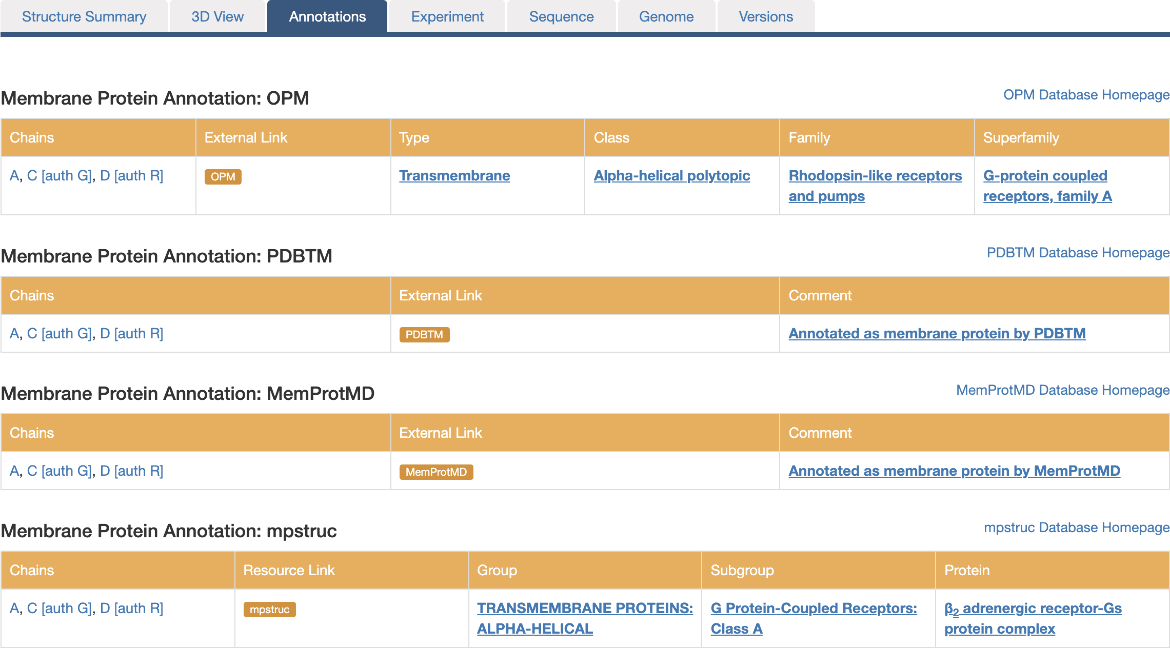 - Clicking on the hyperlinked "Yes" next to the Membrane Proteins row in the top of the page links to the Annotations tab of the structure summary page where additional details from the marked membrane related external resources are provided (Figure 3). Clicking on the hyperlinked "Yes" in the Macromolecules section for specific entities also opens the same Annotations tab (see Figure 2).