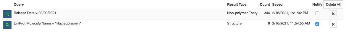 - Set the 'Notify' flag for selected or all queries. If the 'Notify' flag is checked, the query will automatically run each week, shortly after the RCSB PDB archive weekly update. If the search returns any new results based on structures released in the past week, you will receive an email notification listing those structures.