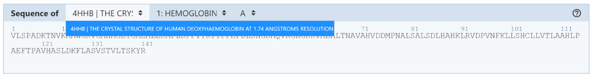 • First drop-down menu: allows the user to decide which structure the sequence should be from. If multiple structures are uploaded into Mol*, this drop-down menu will list the PDB IDs of each structure along with a short summary of each one. The user should click the structure from which they want to view the sequence. If one structure is uploaded into Mol*, there will be only one option in this drop-down menu.