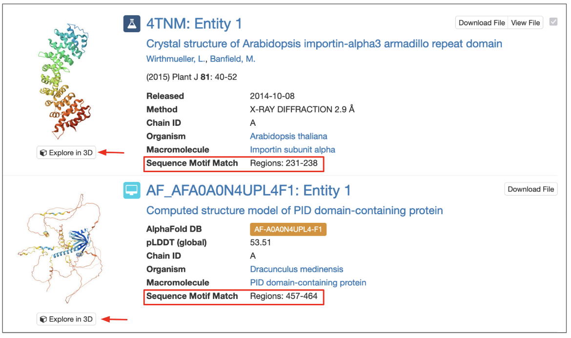 Figure 2: Part of the query results page for a sequence motif search showing the regions of the polymer entity that matches the query sequence motif in a red box. Clicking on the 3D view marked with red arrows opens the structure in Mol*.