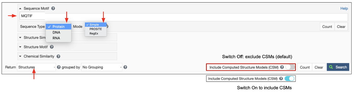 Figure 1: Interface to specify a sequence motif search for Protein, DNA, or RNA sequences in different formats and find polymer entities that match the query. If appropriate, turn on toggle switch to include CSMs in the search.